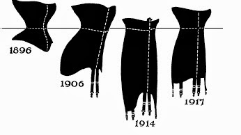 Notice the droop of the bustline and the corresponding narrowness at the back. A lot of this is created by the underwear, which is so important to wear when measuring and fitting. Women wore a camisole or camisette (one-piece camisole and drawers) with a corset on top which reached from the thigh to just under the bust. Essentially, the bust was not supported or pulled up as much as we are used to today. If you are really gung-ho about this, there is an excellent free pattern and tutorial from Festive Attyre for a c. 1916 corset. Jen's pattern and directions are clear and as easy as you'll get when making up such a complicated garment.